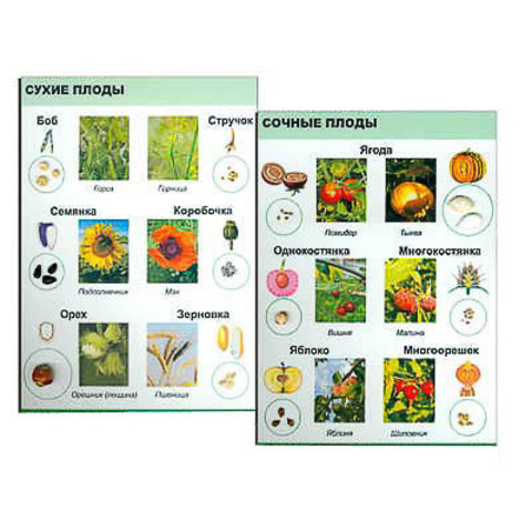 На планшете "Сухие плоды" представлены: боб, стручок, семянка, коробочка, орех, зерновка. На планшете "Сочные плоды" представлены: ягода, однокостянка, многокостянка, яблоко, многоорешек.