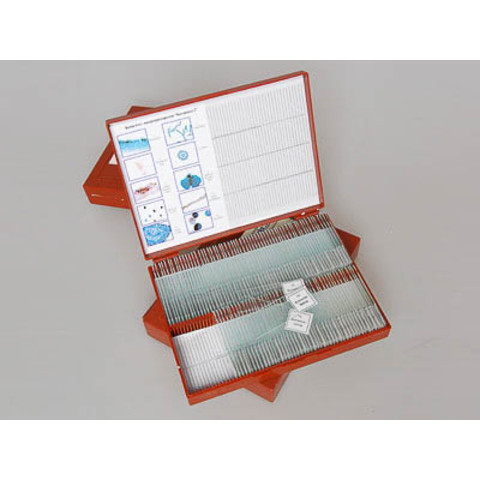 Комплектность: эпидермис листа - 15 шт., продольный разрез зерновки кукурузы - 15 шт., кожица лука - 15 шт., корневой чехлик - 15 шт., пыльца цветкового растения - 15 шт., срез ветки дерева - 15 шт., срез стебля травянистого растения - 15 шт., поперечный срез корня - 5 шт. Всего: 110 шт.