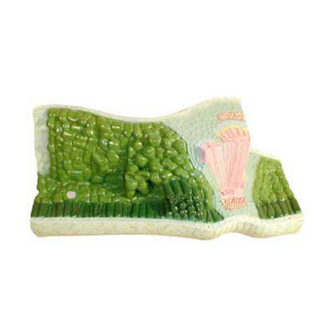 На модели цветом выделены следующие детали строения листа: кожица, палисадный мезофилл, рыхлый мезофилл, устьица, сосуды, волокна, ситовидные трубки.
