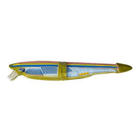 Модель длинной около 40 см, изготовлена из пластмассы. Модель демонстрирует внешнее и внутреннее строение ланцетника. Модель раскрашена в естественные цвета.