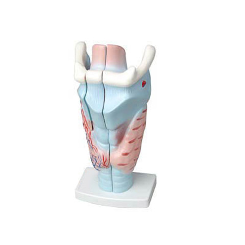 Модель высотой около 20 см, изготовлена из пластмассы и установлена на пластмассовой подставке. Модель является разборной, изображает сагиттальный разрез гортани человека, демонстрирует ее внутреннее строение. Модель раскрашена.