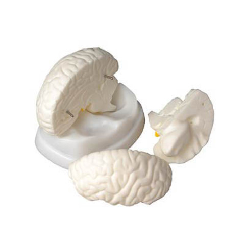 Модель изготовлена из пластмассы и снабжена пластмассовой подставкой. Модель является разборной, изображает внешнее строение головного мозга человека и его сагиттальный разрез. На модели выделены желтым цветом нервные пучки.