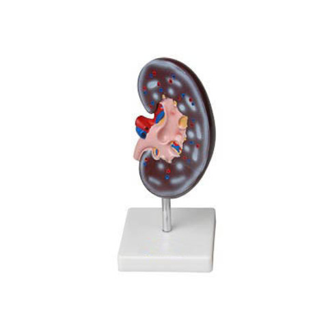 Модель демонстрирует внешнее строение почки человека и ее сагиттальный разрез. Модель окрашена в естественные цвета. На модели представлены следующие элементы строения почки человека: 1. Капсула почки. 2. Корковый слой почки. 3. Большая почечная чашечка. 4. Мозговое вещество (пирамиды). 5. Мочеточник. 6. Почечная лоханка. 7. Почечная вена. 8. Почечная артерия.