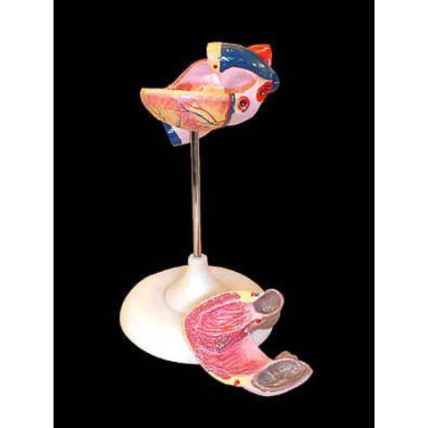 Модель высотой около 10 см, изготовлена из пластмассы и установлена на пластмассовой подставке. Модель является разборной, изображает внутреннее строение сердца человека. Модель раскрашена.