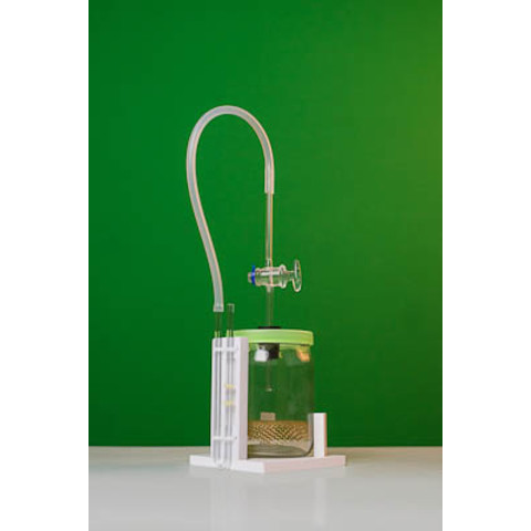 Прибор состоит из стеклянного сосуда, установленного на основании с U-образным манометром, снабженным указателями уровня. Сосуд разделен сеткой на две части. В крышку сосуда вставляется резиновая пробка с зажимом (краном) и трубкой. Свободный конец трубки подсоединяется к манометру. Для заполнения манометра подкрашенной жидкостью к прибору прилагается шприц с иголкой, закрытой колпачком.