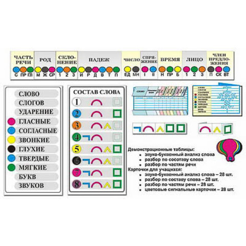 Комплект учебных наглядных пособий включает в себя 3 демонстрационных пособия для учителя и 4 набора по 28 карточек раздаточного материала для учащихся. Комплект пособий используется на всем протяжении обучения ученика в начальной школе.