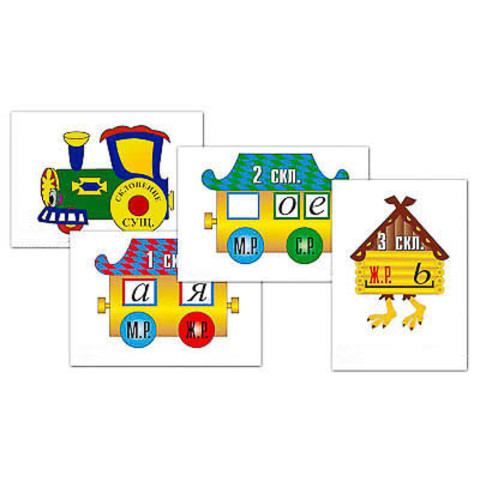 Пособие состоит из 4 полноцветных таблиц формата 27*39 см, ламинированных матовой пленкой. Таблицы посвящены трем склонениям имен существительных, изобразительно объединены темой паровоза и путешествия, что отражается и становится понятным в ходе урока.