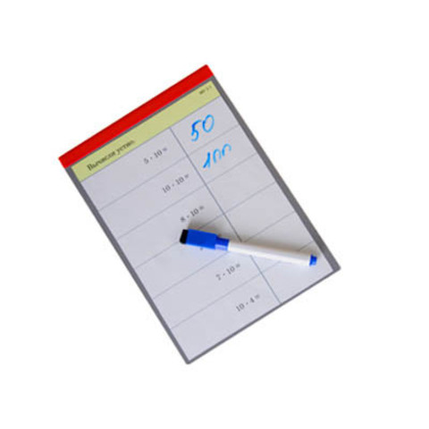 Планшет размером 150*210 мм изготовлен из пластика. На лицевой стороне планшета закреплена пленка, под которую может помещаться карточка с заданиями. Ответы записываются на пленке маркером на водной основе. Надписи можно стирать специальным ластиком, закрепленным в колпачке. Планшеты можно использовать с карточками, подготовленными самостоятельно. Размещение на оборотной стороне карточки заданий с ответами дает возможность учащимся самостоятельно проверить правильность решения, оценить свою работу и исправить ошибки. Кроме того, можно предложить учащимся самостоятельно составить задания.