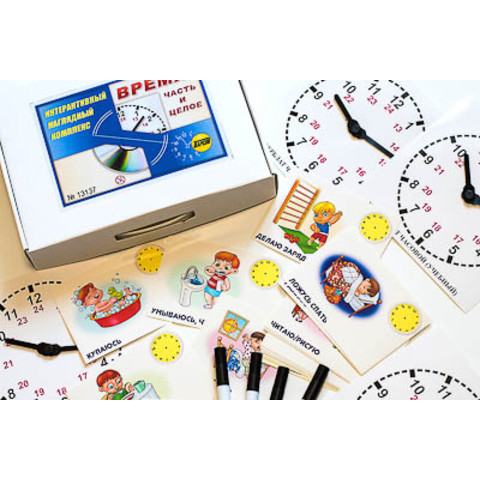 Комплектность: карточки «Режим дня» – 12 шт., карточки «Электронные часы» – 4 шт., карточки «Минуты» – 4 шт., циферблаты – 8 шт., маркеры на водной основе – 4 шт., интерактивное приложение на электронном носителе – 1 шт., руководство по эксплуатации – 1 шт.