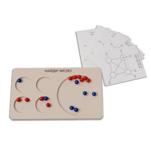 Игровое поле представляет собой пластину с четырьмя одинаковыми лунками и еще одной, большего диаметра. В большую лунку высыпают красные и синие шарики. Красные шарики обозначают число "1", синие – "5", что сделано для удобства представления больших чисел (так число 19 можно представить тремя синими шариками и четырьмя красными). Необходимо разложить шарики в соответствии с указанными на карточке суммами чисел в лунках (в столбцах, строках и по диагоналям) и числом в одной лунке. Карточки напечатаны на картоне и ламинированы глянцевой пленкой.