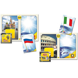 На карточках для правой части игрового поля изображены флаги и часть карты мира, они служат продолжением изображений на игровых полях и содержат общие с ним детали фона. На карточках для левой части игрового поля дана врезка, на которой представлены предметы, являющиеся как бы «визитной карточкой» данной страны. Контуры врезки (вырезанные уголки) служат подсказкой.
