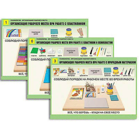 Таблицы раздаточные (для леворуких детей): 1. Организация рабочего места при работе с пластилином. 2. Организация рабочего места при работе с бумагой и картоном. 3. Организация рабочего места при работе с природным материалом. 4. Организация рабочего места при работе с текстилем. 5. Организация рабочего места при работе с набором деталей "Конструктор". 6. Организация рабочего места при работе с пластиком и пенопластом.