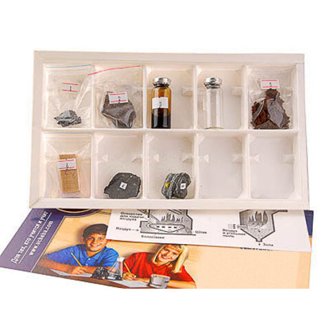 Образцы пронумерованы согласно списку и упакованы в коробку с ячейками. Пособие комплектуется руководством по эксплуатации и ламинированным вкладышем с иллюстрациями различных способов сжигания топлива.