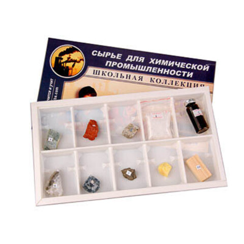 Состав коллекции: апатит, боксит (алюминий), нефелин, поваренная соль, нефть , кальцит, флюорит, пирит, сера, древесина.