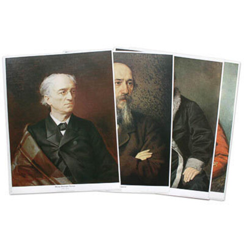 Комплектность: 16 репродукций (размером 40х50 см, плотность бумаги 230-250 г), упаковочная папка. Пособие представляет собой набор репродукций портретов русских писателей XIX века, выполненных русскими художниками, изготовленных на плотной небликующей бумаге. В состав набора включены портреты А.Н. Островского, Н.А. Некрасова, В.А. Жуковского, А.И. Герцена, И.С. Тургенева, А.С. Пушкина, А.П. Чехова, И.А. Крылова, Л.Н. Толстого, М.Е. Салтыков-Щедрина, А.С. Грибоедова, Ф.М. Достоевского, Н.В. Гоголя, А.А. Фета, Ф.И. Тютчева, М.Ю. Лермонтова.​