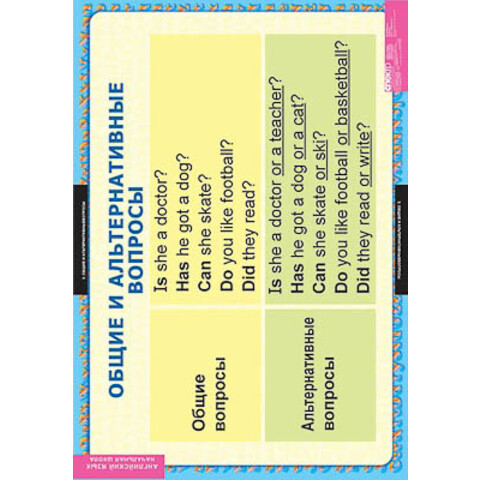 Учебный альбом из 8 листов. Формат 68х98 см. Общий вопрос. Краткие ответы. Общие и альтернативные вопросы. Вопрсительные слова. Специальный вопрос. Вопрос к подлежащему. Ответ на вопрос к подлежащему. Отрицательные предложения.