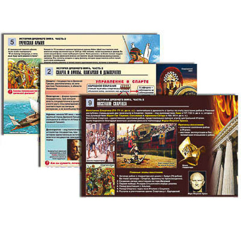 Пособие состоит из 12 полноцветных таблиц, ламинированных глянцевой пленкой. Таблицы: 1. Микенская цивилизация. 2. Спарта и Афины. Олигархия и демократия. 3. Греко-персидские войны. 4. Олимпийские игры. 5. Греческая армия. 6. Завоевательные походы Александра Македонского. 7. Пунические войны. Рим и Карфаген. 8. Римская республика в III в. до н. э. 9. Восстание Спартака. 10. Римский легион. 11. Памятники искусства и архитектуры Древнего Рима. 12. Зарождение христианства.