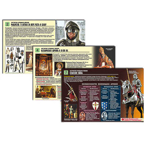 Таблицы: 1. Духовенство. В молитвах за род человеческий. 2. Рыцарство. В битвах за веру, честь и славу. 3. Крестьянство. В трудах и заботах о хлебе насущном. 4. Католическая церковь в XI–XIII вв. 5. Инквизиция. 6. Возникновение ислама. 7. Столетняя война. 8. Архитектура Западной Европы XI–XV вв.