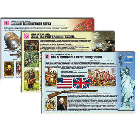 Таблицы: 1. Колонизация Южной и Центральной Америки. 2. Реформация. Религиозные течения. 3. Система "политического равновесия" XVI–XVII вв. 4. Эпоха Возрождения. Леонардо да Винчи. 5. Быт европейца XV–XVIII вв. 6. Война за независимость в Америке. Воюющие стороны.
