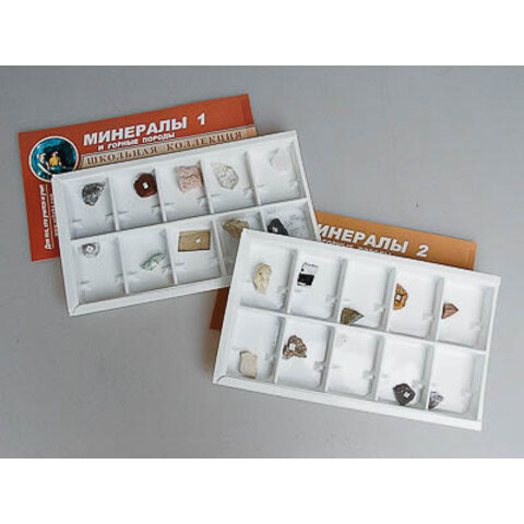 Образцы пронумерованы соответственно списку и положены в две коробки с ячейками. Пособие комплектуется руководством по эксплуатации и ламинированным вкладышем, содержащим информацию о составе и применении минералов и горных пород.