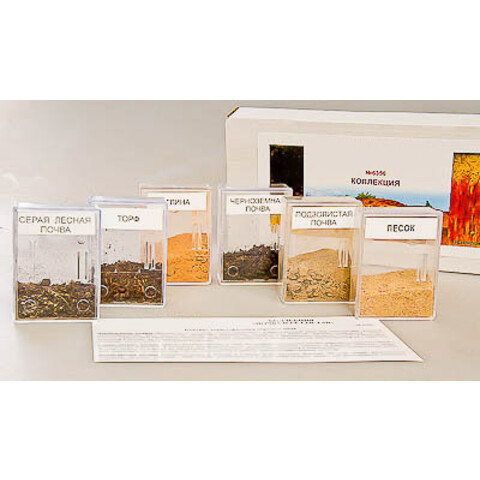Коллекция предназначена для использования в качестве демонстрационного материала. Габаритные размеры в упаковке (дл.*шир.*выс.), см: 30,5*22*3,5. Вес, кг, не более 0,7. Коллекция включает образцы почв и почвообразующих пород. Образцы помещены в прозрачные пластмассовые коробки, снабженные наклейками с наименованием. Пособие комплектуется руководством по эксплуатации и ламинированным вкладышем, содержащим информацию о свойствах, территории распространения и использовании почв и почвообразующих пород. Состав коллекции: образцы черноземной, серой лесной и подзолистой почв, образцы песка, глины и торфа.