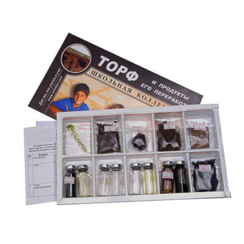 Состав коллекции: мох сфагнум, торф, торф брикетированный, торфопесчаная смесь, торфоперегнойные горшочки, активный уголь (активированный уголь), масло легкое, газ, торфяной воск, этиловый спирт, карболовая кислота, масло креолиновое, деготь, пек.