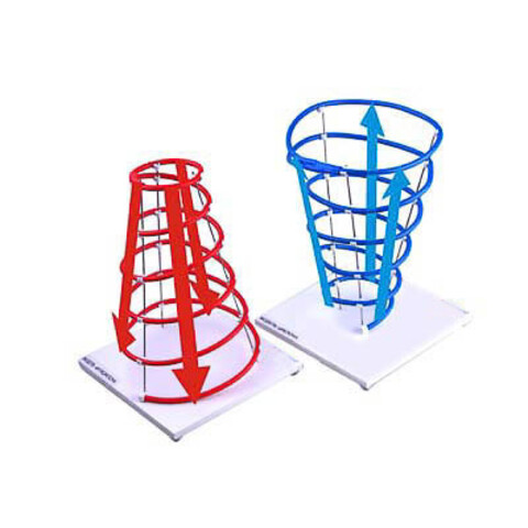 Пособие состоит из моделей циклона и антициклона, имеющих спиралевидную форму и устанавливаемых на подставке. В соответствии с общепринятым обозначением синяя спираль представляет циклон, красная – антициклон. Цветные стрелки, входящие в комплект, обозначают нисходящие и восходящие потоки воздуха.