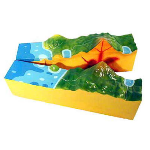 Модель изготовлена из пластмассы. Модель изображает строение вулкана и различные аспекты вулканической деятельности. На модели показаны: конус выноса, кратер вулкана, лава вулканическая, барранкосы, фумаролы, берег моря.