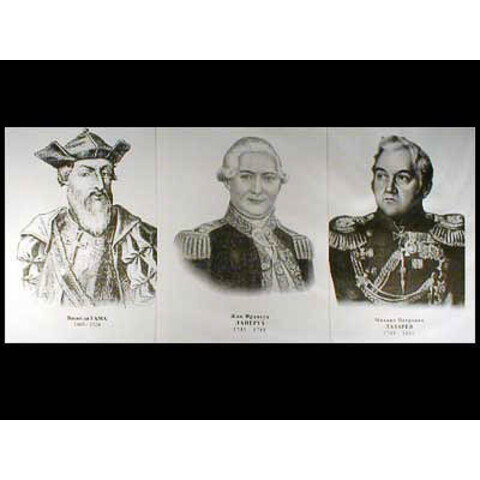 Представляют собой комплект портретов формата А3 в количестве 25 шт., выполненных на качественной белой бумаге. На портретах указаны фамилии (с именами, либо с именами и отчествами) и даты жизни путешественников.