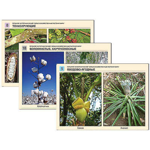 Пособие состоит из 18 полноцветных листов, напечатанных на картоне и ламинированных матовой (антибликовой) пленкой. Представлено 36 фотографий сельскохозяйственных культур: зерновых, сахароносных, плодовых, тонизирующих, масличных, орехоплодных, крахмалоносных, пряных, волокнистых и каучуконосных.