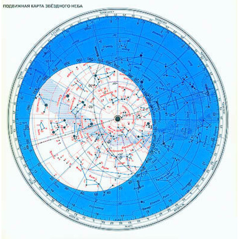 Карта состоит из двух кругов: основного и подвижного. На основной круг нанесены черными кружками звезды ярче третьей звездной величины и некоторые более слабые. Диаметры кружков отличаются в зависимости от блеска звезд. Группами точек и черточек показаны некоторые звездные скопления, туманности и галактики. Широкая голубая полоса – Млечный Путь. Границы созвездий показаны пунктирными линиями, сетка экваториальных координат (склонение δ и прямое восхождение α) – голубыми линиями. В центре Северный полюс мира. Окружность, имеющая нулевое склонение, – небесный экватор. Черная овальная линия, пересекающая небесный экватор в двух точках (весеннего и осеннего равноденствия), – эклиптика.