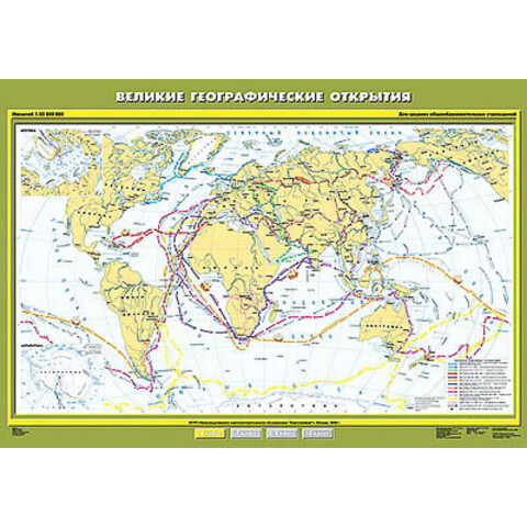 Масштаб 1:25000000, формат 140*100 см. Цветными стрелками показаны маршруты основных путешествий первопроходцев. Односторонняя печать, двустороннее ламинирование, лицевая сторона покрыта матовым ламинатом.