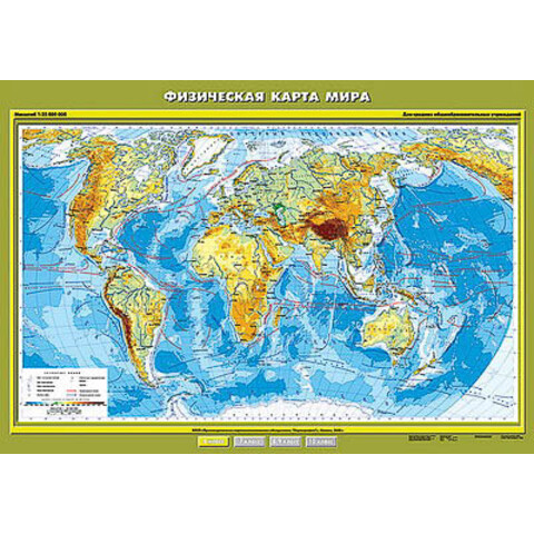 Карта содержит информацию о реках, озерах, отметках глубин и высот, вулканах, ледниках, морских течениях. Фоновой окраской даются формы рельефа суши и океанов.