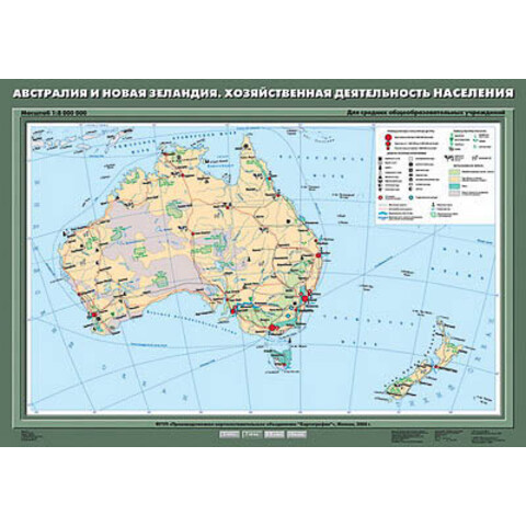 Красными кругами на карте изображены промышленные и культурные центры: крупнейшие, крупные, прочие важные. Геометрическими значками показана добыча полезных ископаемых, художественными значками даны районы распространения основных растительных культур и животноводства. Фон карты показывает использование земель.