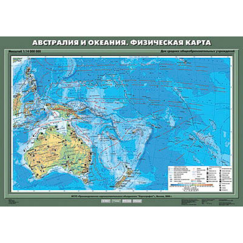Формат 100*70 см. На карте показаны формы рельефа Австралии,полезные ископаемые,моря,омывающие Австралию и морские течения. Односторонняя печать, двустороннее ламинирование, лицевая сторона покрыта матовым ламинатом.