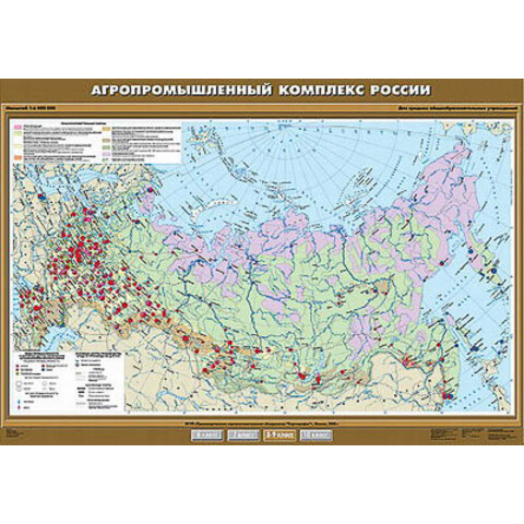 Кругами различного размера на карте даны центры пищевой промышленности: крупнейшие, крупные, средние, малые. Окраска внутри круга и цветные значки дают представление о видах промышленности и основных центрах переработки сельскохозяйственного сырья. Особыми значками выделены центры производства минеральных удобрений, машин и оборудования для АПК.