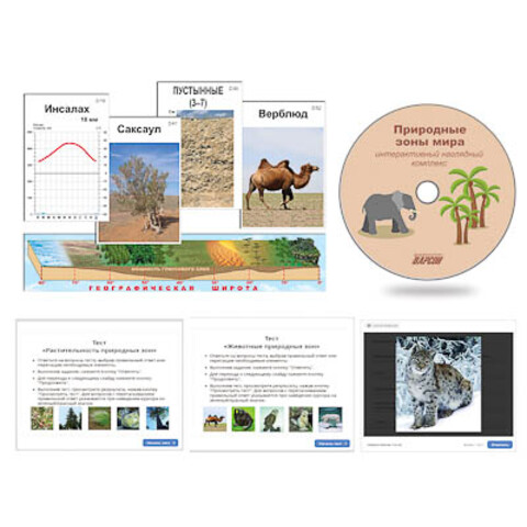 Интерактивный наглядный комплекс предназначен для использования в средней школе на уроках географии при объяснении нового материала тем «Климат», «Почвы», «Растительность», «Животный мир», на обобщающем уроке по природным зонам, закреплении и проверке знаний обучающихся, а также на викторинах при игре в командах.