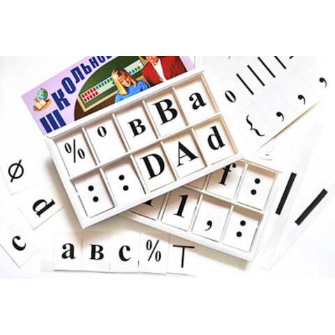 Пособие представляет собой ламинированные пленкой листы с напечатанными на них цифрами, буквами и математическими знаками. В комплекте представлены латинские прописные и строчные печатные буквы.