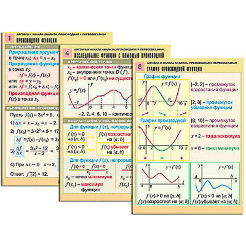 Комплект учебно-наглядных пособий формата А1 с полноцветной двухсторонней печатью и матовой двухсторонней ламинацией в количестве 12 таблиц: 1. Производная функции. 2. Производные основных функций. 3. Вычисление производной. 4. Исследование функции с помощью производной. 5. Касательная к графику функции. 6. Физический смысл производной. 7. Наибольшее и наименьшее значения функции. 8. График производной функции. 9. Вторая производная функции. 10. Первообразная. 11. Вычисление первообразных. 12. Площадь криволинейной трапеции. Интеграл.