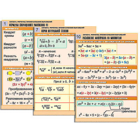 Комплект учебно-наглядных пособий формата А1 с полноцветной двухсторонней печатью и матовой двухсторонней ламинацией в количестве 10 таблиц: Формулы сокращенного умножения (1). Формулы сокращенного умножения (2). Степени с натуральным и целым показателями. Степень с рациональным показателем. Квадратный корень и его свойства. Действия с квадратными корнями. Корни натуральной степени. Одночлены и многочлены. Действия с многочленами. Разложение многочлена на множители.