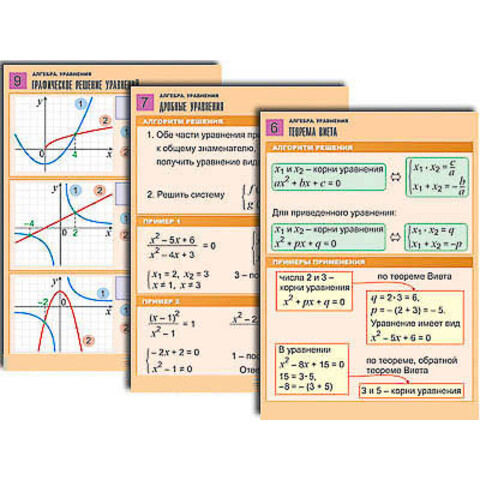 Комплект учебно-наглядных пособий формата А1 с полноцветной двухсторонней печатью и матовой двухсторонней ламинацией в количестве 8 таблиц: Прямая пропорциональность. Обратная пропорциональность. Линейная функция. Функция y = x^2 , y = x ^3. Функции v x , 3v x. Квадратичная функция (1). Квадратичная функция (2). Функции и их графики.
