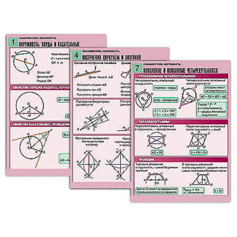 Комплект учебно-наглядных пособий формата А1 с полноцветной двухсторонней печатью и матовой двухсторонней ламинацией в количестве 8 таблиц: 1. Окружность. Хорды и касательные. 2. Окружность, описанная около треугольника. 3. Окружность, вписанная в треугольник. 4. Построения циркулем и линейкой. 5. Центральные и вписанные углы. 6. Свойства хорд и секущих. 7. Вписанные и описанные четырехугольники. 8. Длина окружности и площадь круга.