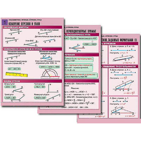 Комплект учебно-наглядных пособий формата А1 с полноцветной двухсторонней печатью и матовой двухсторонней ламинацией в количестве 8 таблиц: 1. Измерение отрезков и углов. 2. Смежные и вертикальные углы. 3. Биссектриса угла. Перпендикулярные прямые. 4. Признаки параллельности прямых. 5. Свойства параллельных прямых. 6. Сумма углов треугольника. Внешний угол треугольника. 7. Построение отрезков, заданных формулами (1). 8. Построение отрезков, заданных формулами (2).