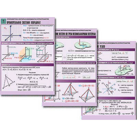 Комплект учебно-наглядных пособий формата А1 с полноцветной двухсторонней печатью и матовой двухсторонней ламинацией в количестве 8 таблиц: 1. Прямоугольная система координат. 2. Линейные операции над векторами. 3. Скалярное произведение векторов. 4. Разложение вектора по трем некомпланарным векторам. 5. Вычисление углов. 6. Уравнение плоскости. 7. Уравнение сферы. 8. Векторный и координатный методы решения задач.