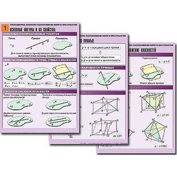 Комплект учебно-наглядных пособий формата А1 с полноцветной двухсторонней печатью и матовой двухсторонней ламинацией в количестве 8 таблиц: 1. Основные фигуры и их свойства. 2. Взаимное расположение прямых в пространстве. 3. Скрещивающиеся прямые. 4. Взаимное расположение прямой и плоскости. 5. Перпендикулярность прямых и плоскостей. 6. Параллельность прямых и плоскостей. 7. Взаимное расположение плоскостей. 8. Теорема о трех перпендикулярах.