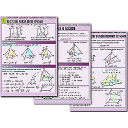 Комплект учебно-наглядных пособий формата А1 с полноцветной двухсторонней печатью и матовой двухсторонней ламинацией в количестве 8 таблиц: 1. Расстояние между двумя точками. 2. Расстояние от точки до прямой. 3. Расстояние от точки до плоскости. 4. Расстояние между скрещивающимися прямыми. 5. Угол между скрещивающимися прямыми. 6. Угол между прямой и плоскостью. 7. Двугранные углы. 8. Угол между двумя плоскостями.