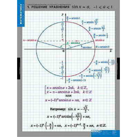 Учебный альбом из 7 листов, формат 68*98 см.Решение уравнения sin x=a. Решение уравнения сos x=a. Решение уравнения tg x=a. Решение уравнения ctg x=a. Решение неравенства сos x < a. Решение неравенства tg x < a. Решение неравенства ctg x > a.