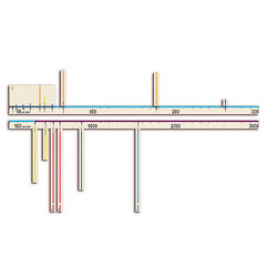 Изображения на карточках цветные, отпечатаны на магнитном виниле. Все шкалы имеют длину 1,5 м и деления через каждые 5 см. Три шкалы – линейные и имеют каждая свой масштаб расстояний (в одном делении 10, 100 и 10 000 св. лет соответственно). Две другие шкалы – логарифмические, одна в св. годах, другая – в км.