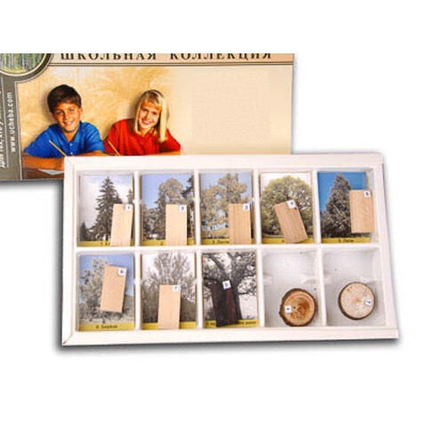 Автор: И. Л. Марголина. Коллекция предназначена для использования в качестве раздаточного материала. Комплектность: образцы древесин (продольные срезы) – 8 шт., образцы древесин (поперечные срезы) – 2 шт., фотографии растений – 8 шт., руководство по эксплуатации – 1 шт. В состав коллекции входят образцы древесины древесных растений, наиболее распространенных на территории России (ели, сосны, лиственницы, дуба, липы, березы, осины), а также африканского черного дерева как представителя ценных пород древесины. Продольные срезы перечисленных растений, а также поперечные срезы ели и осины демонстрируют структуру, цвет и текстуру древесины. Натуральные материалы сопровождают 8 цветных фотографий (5x7 см) общего вида растений. Фотографии напечатаны на картоне и ламинированы глянцевой пленкой. Образцы пронумерованы.
