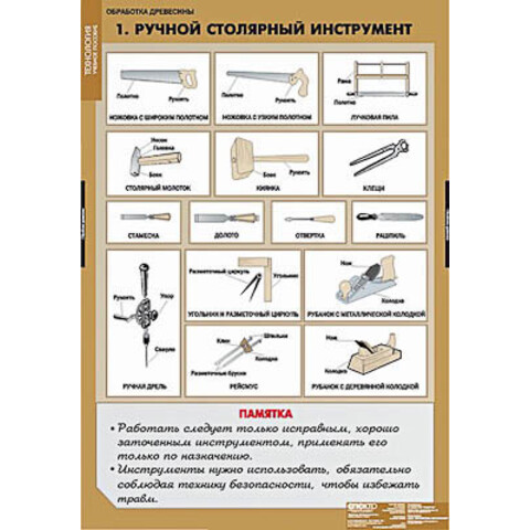 Ручной столярный инструмент. Устройство столярного верстака. Типы графических изображений. Чтение чертежа. Технологическая карта. Разметка заготовок. Строгание, сверление, долбление. Пиление, выпиливание, зачистка. Сборка изделий. Токарный и сверлильный станки. Правила поведения в мастерских. CD диск.